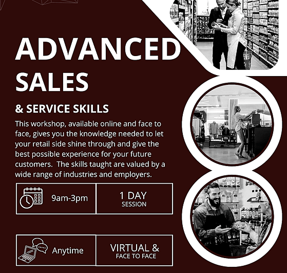 Advanced Sales & Service SkillsDoes your client want to upskill or learn new retail skills? The knowledge shared throughout this course is valued by a wide range of industries and employers. Customers’ needs and wants, USP, body language, product benefits and features and dealing with difficult customers are only some of the skills taught throughout this course. After completing this six-hour workshop, a certificate and letter of recommendation will be provided for the client.