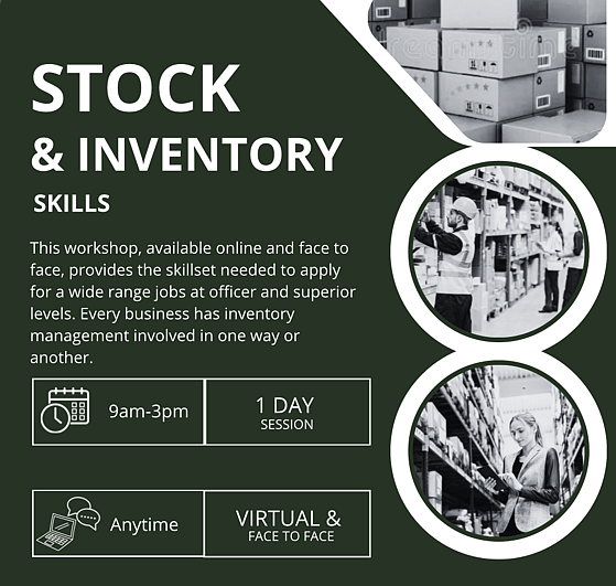 Stock & Inventory SkillsIs your client interested in the knowledge and skills needed to run their own storeroom? Every business has inventory management involved in one way or another. This workshop enables clients a range of tools to add to their toolkit: stock take, manging stock, classification of demand and use of inventory software name only a few. After completing this six-hour workshop, a certificate and letter of recommendation will be provided for the client.